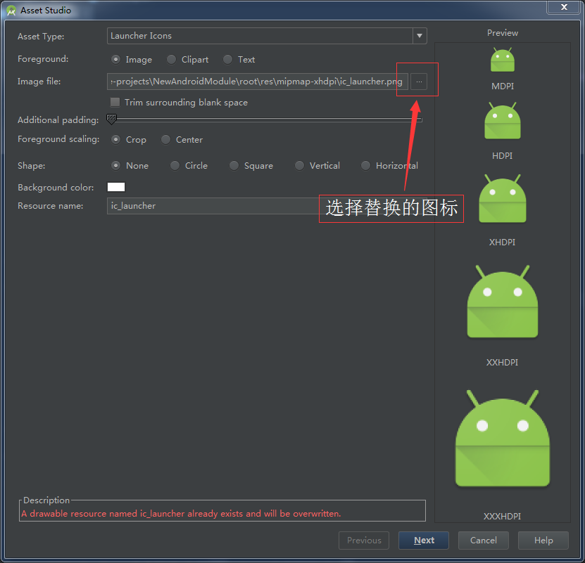 如何修改图标:既然安装了Studio,即可直接用它来修改图标,打开工程,在Android目录上点右键,New/Image Asset,在对话框中修改Luanch Icon,之后保存到Android/res/,此时需要对应修改android/