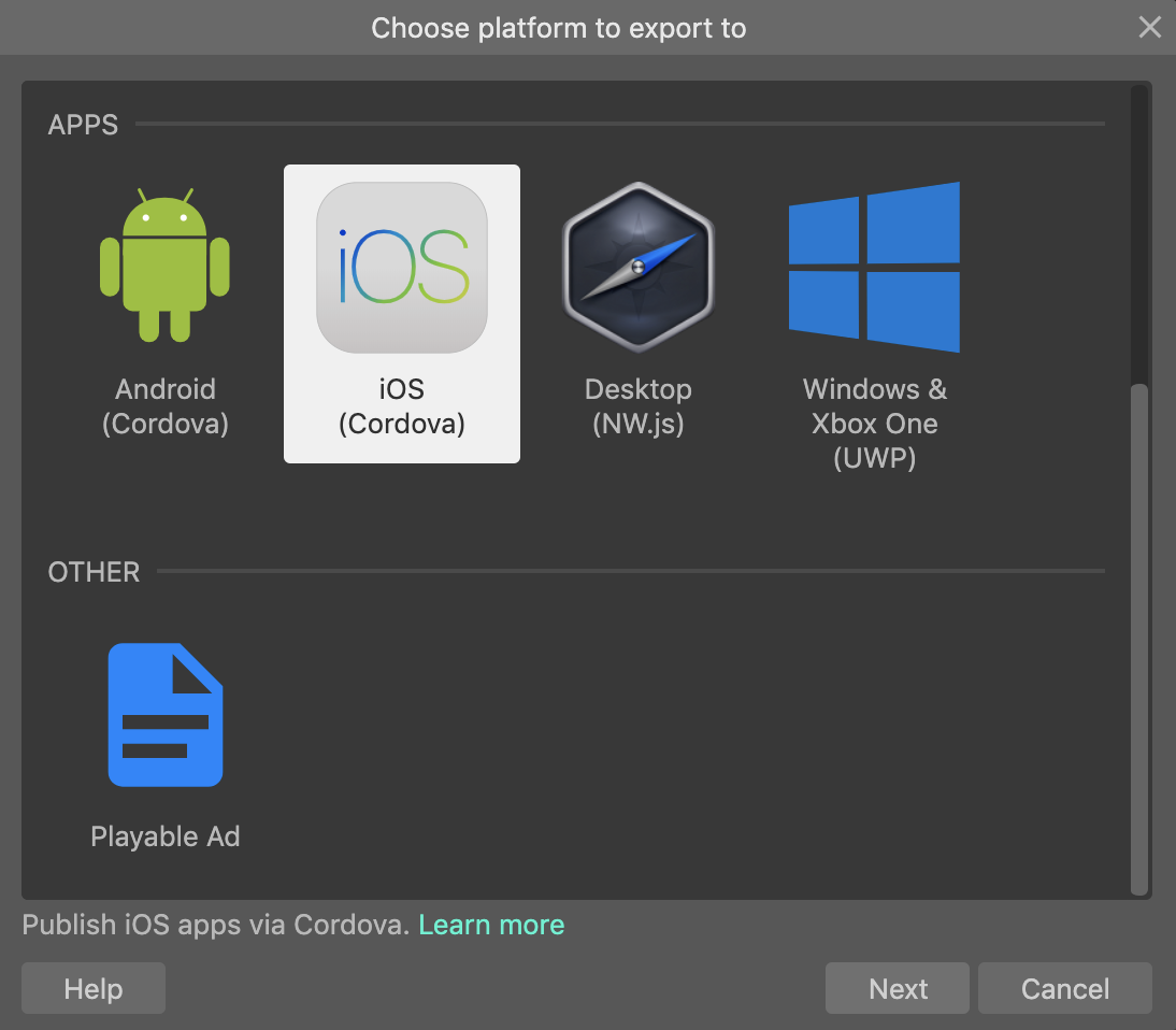 C3可以直接从Project菜单下Export进行打包。选择iOS打包即可。