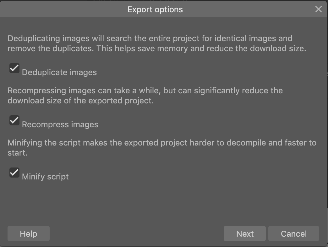 图片排重:这个选项对我很有用,我很喜欢用50*50px的全透明精灵当作逻辑碰撞体,或者又经常Clone一个精灵原型,选中这个选项,重复的图片就只会用1个