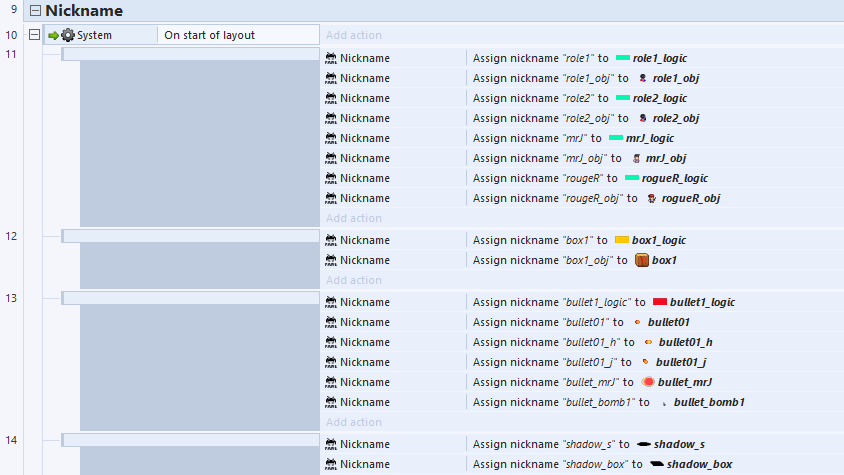 命名 :在项目开始的时候为每个Object添加nickname,使用nickname行为中的Assign nickname事件,选择具体的Object,并为其命名。当Object较多时,这里会需要大量的命名初始化,为后面创建做准备。
