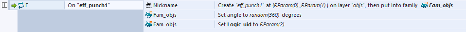 创建 :在需要创建的时候,使用nickname插件中的Create instance into family事件(如果不需要后续SOL的参数配置,也可以不用family)。填入需要创建的Object的nickname命名字符串,创建的XY坐标,创建图层,以及用来pick的Family物件组。
